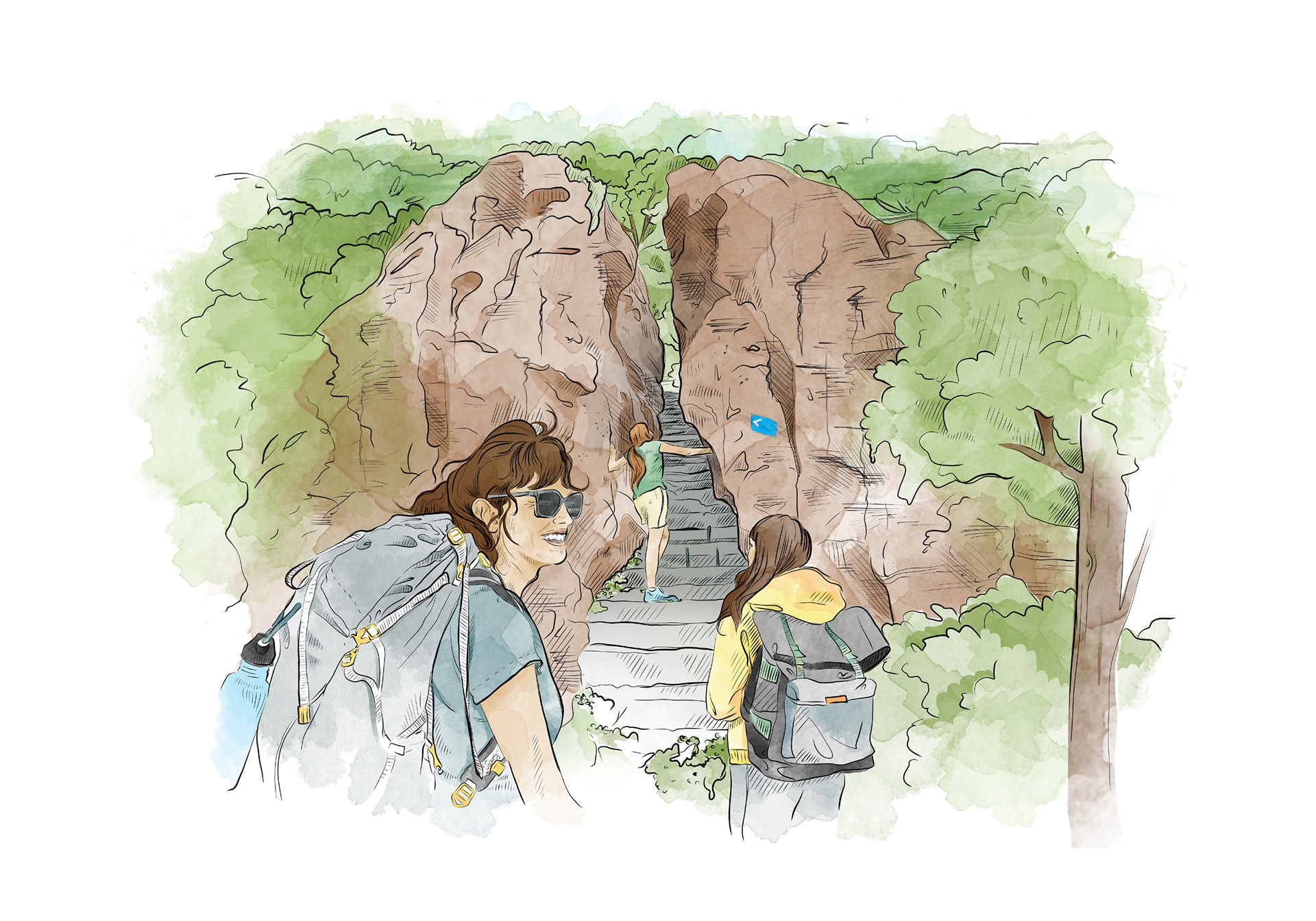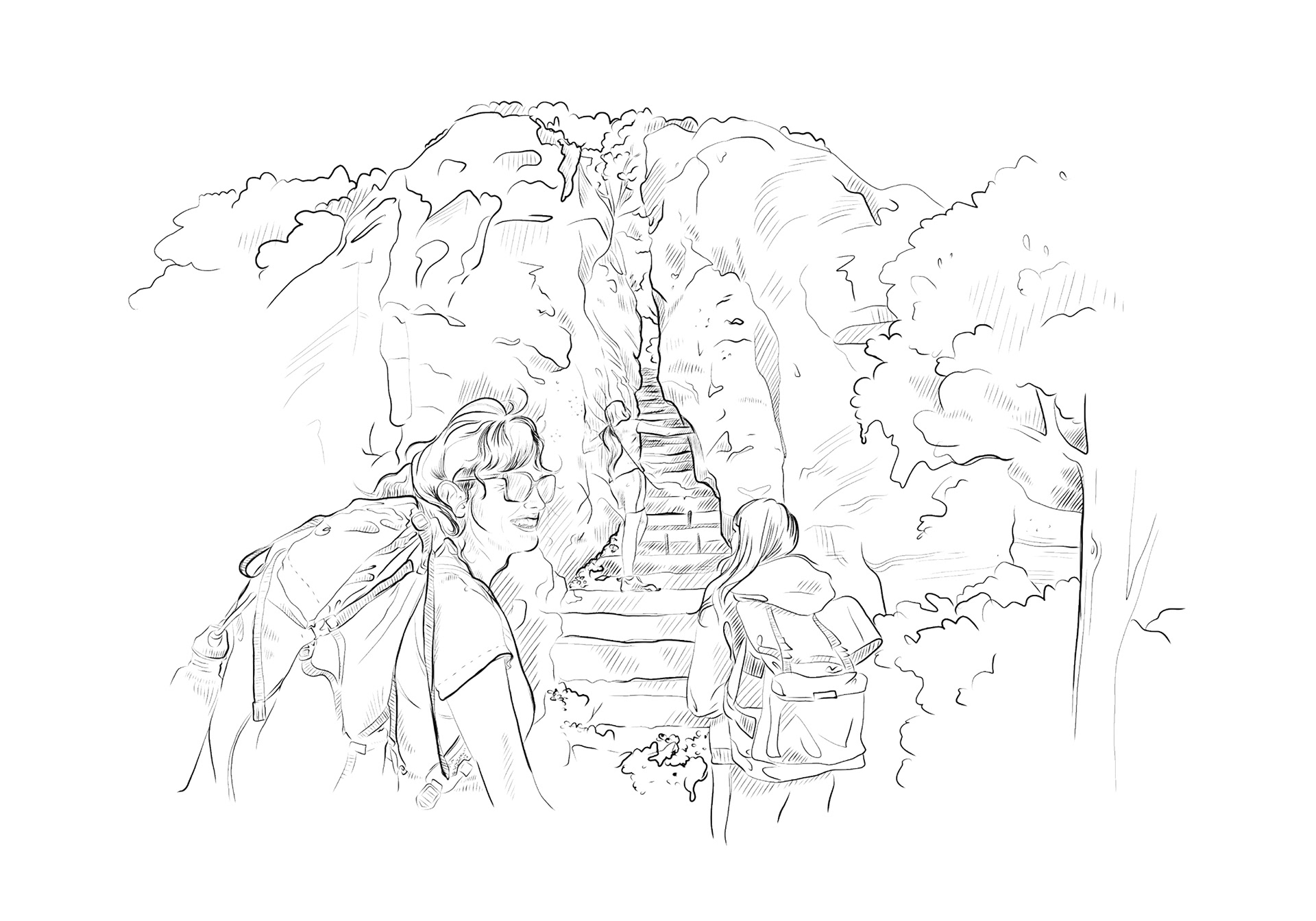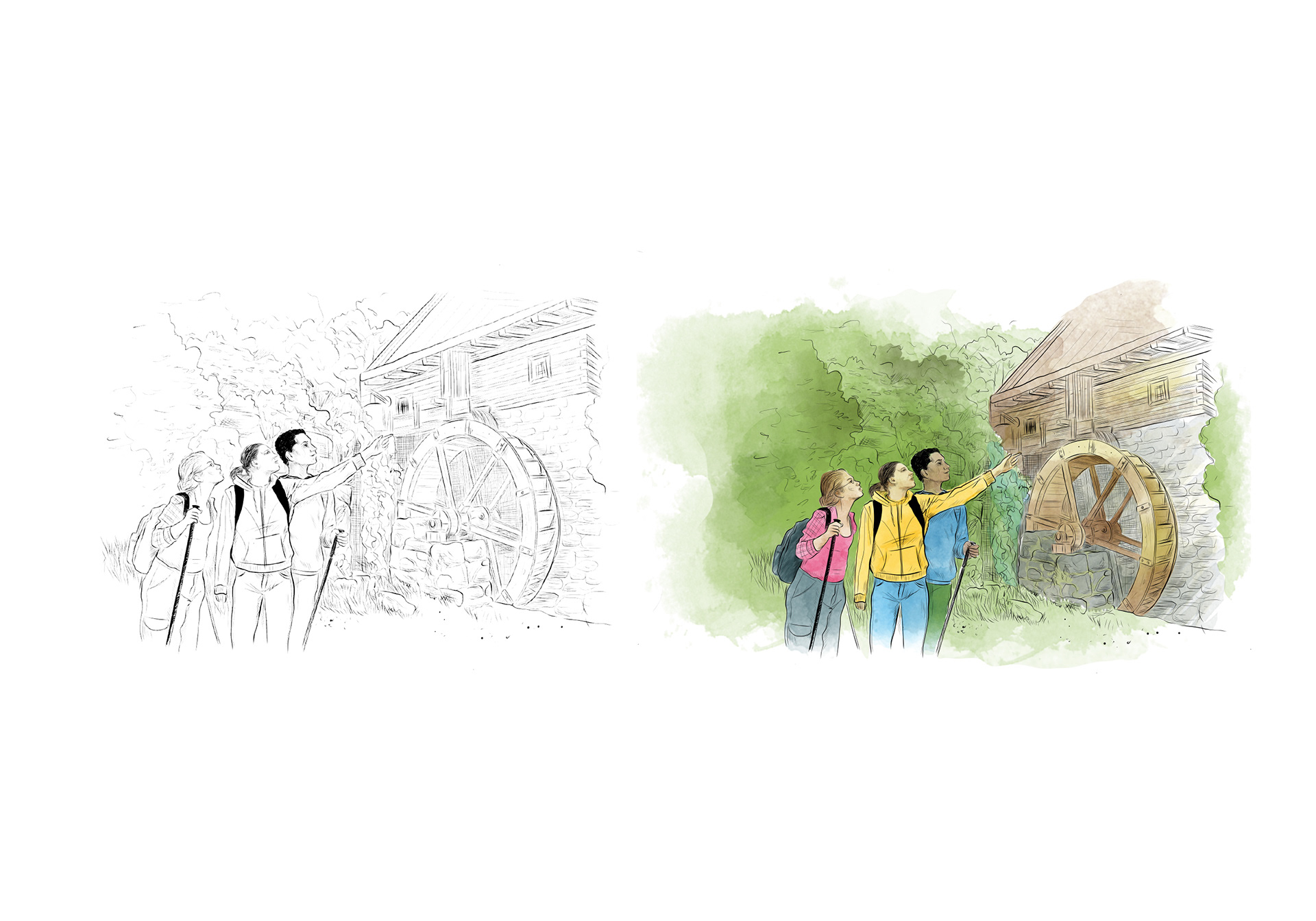 Through emotional, colorful hand drawings, we bring the multifaceted character of the Mullerthal to life - from vibrant economic and cultural elements to places of encounter and the region’s powerful natural scenery.