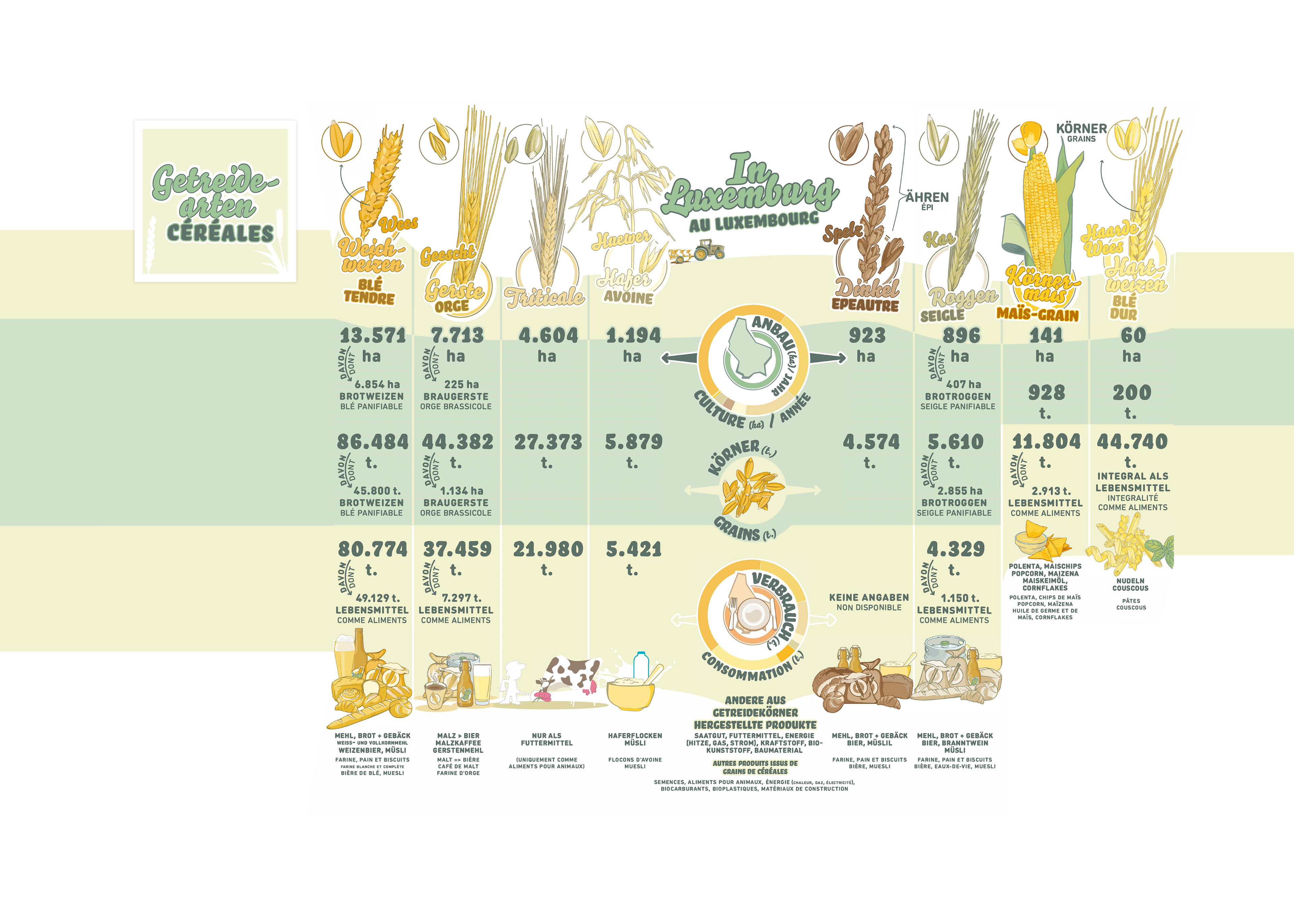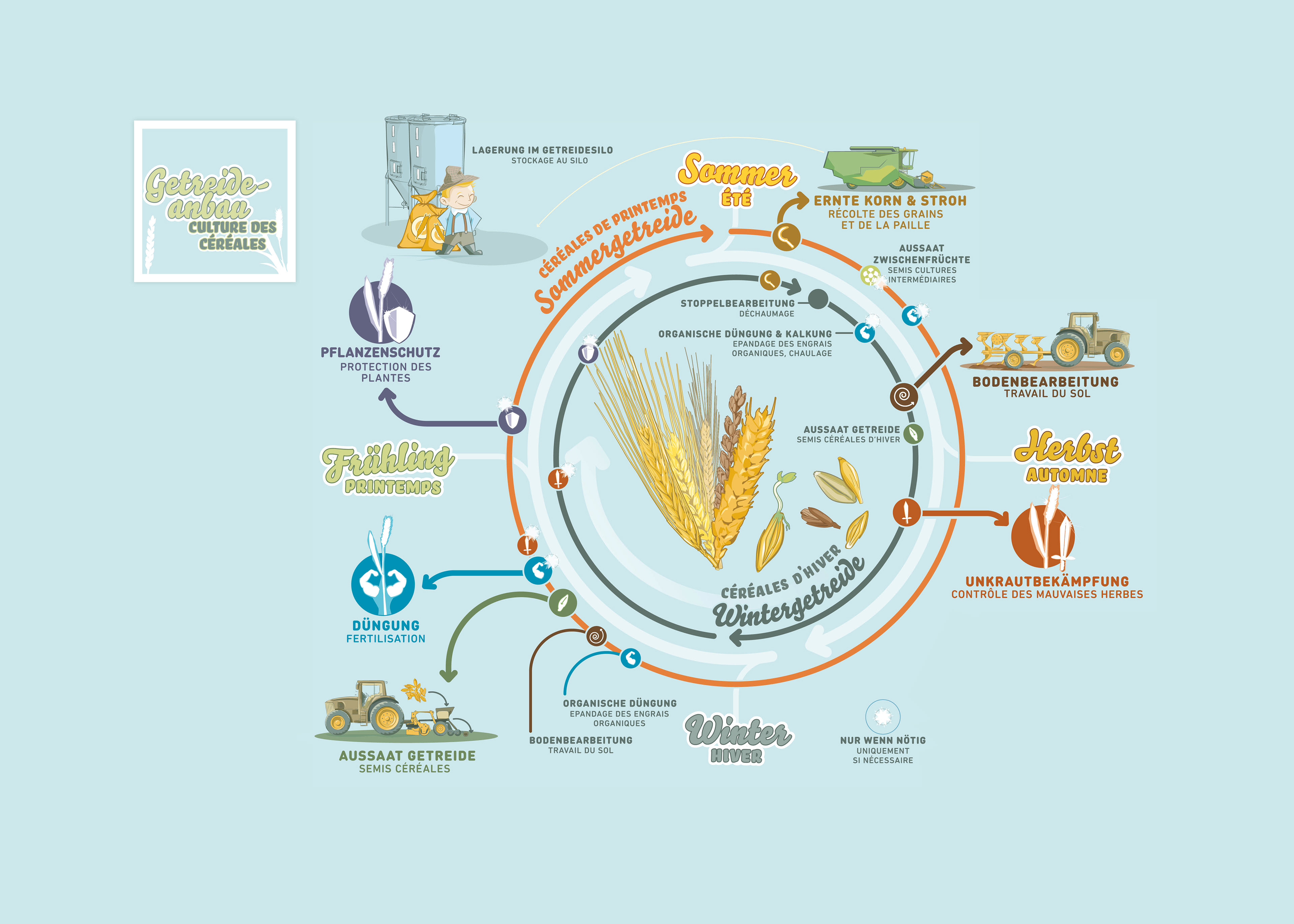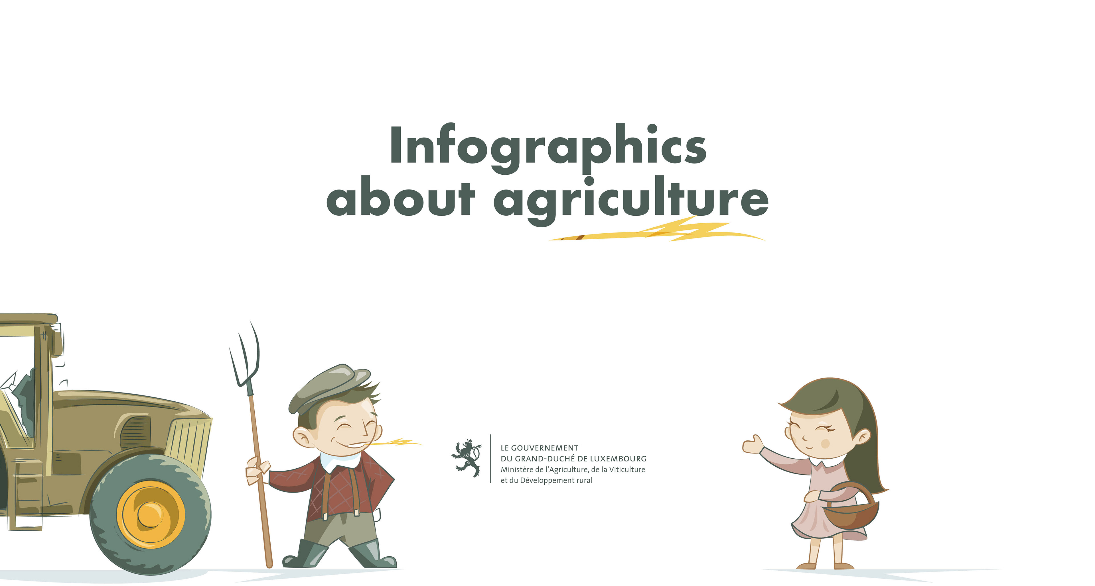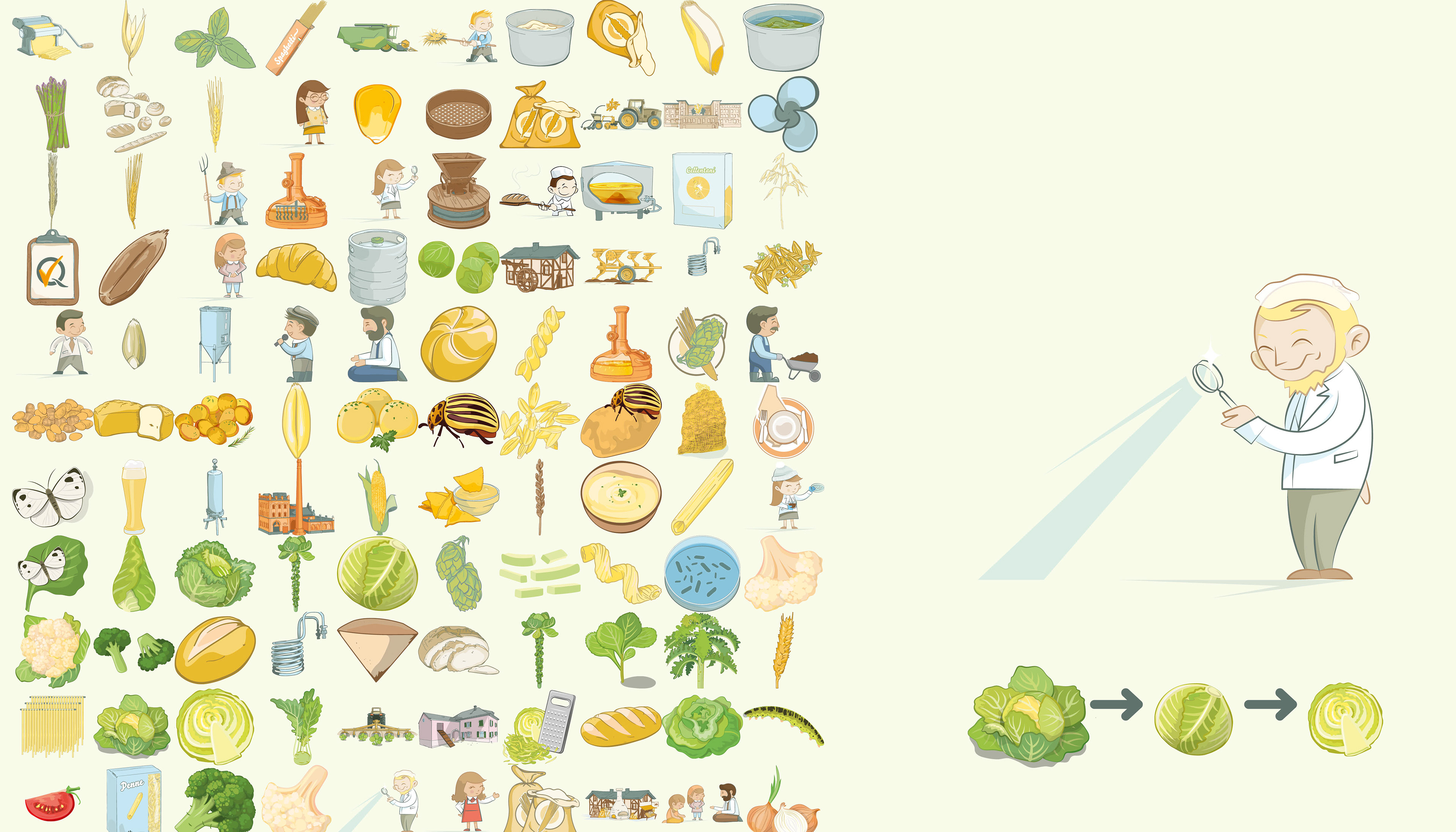 Visualization of different agricultural activities. 10 great information graphics on different topics of agriculture such as pasta production, bread and wheat, vegetable cultivation, solidarity farming...